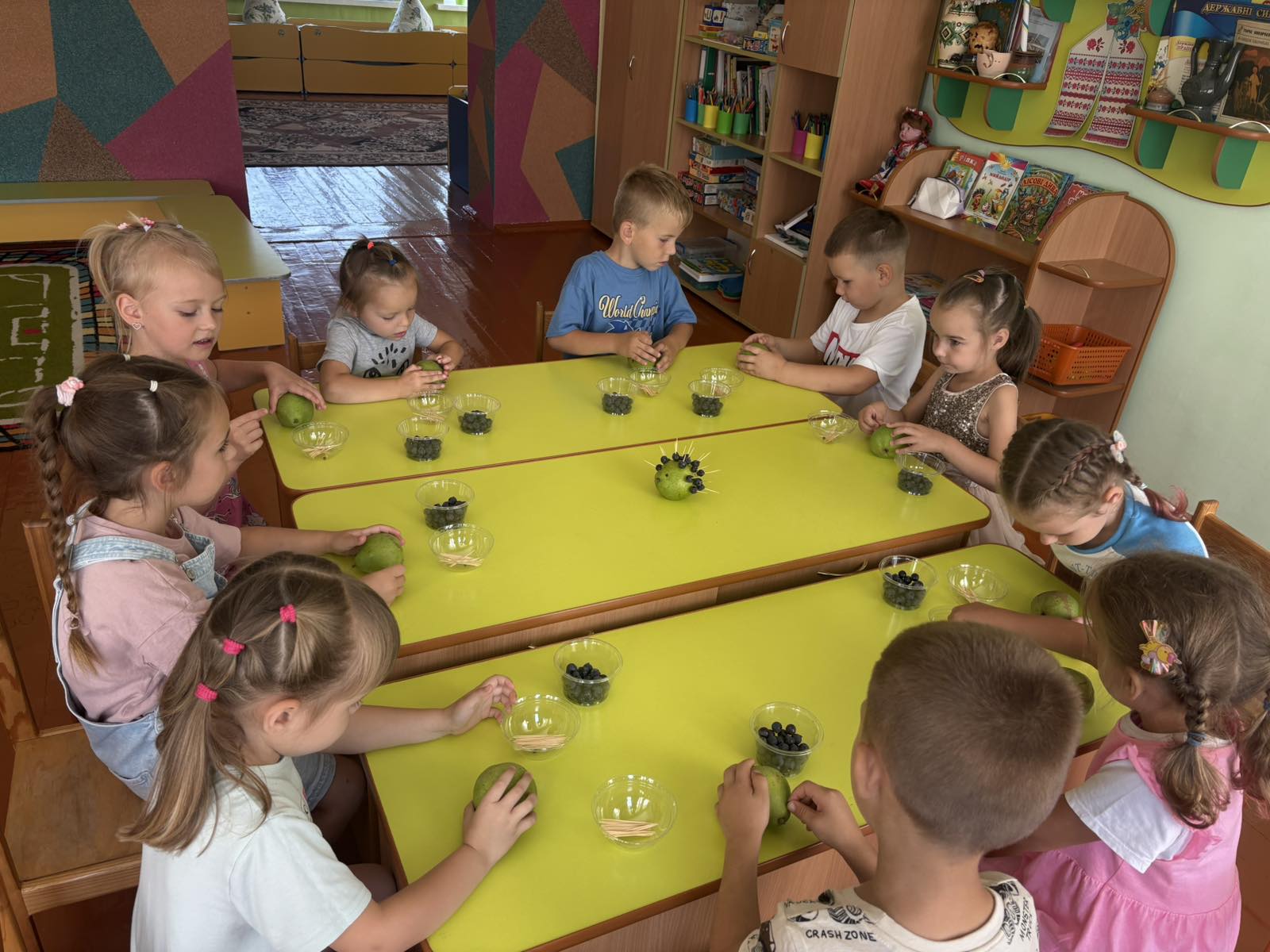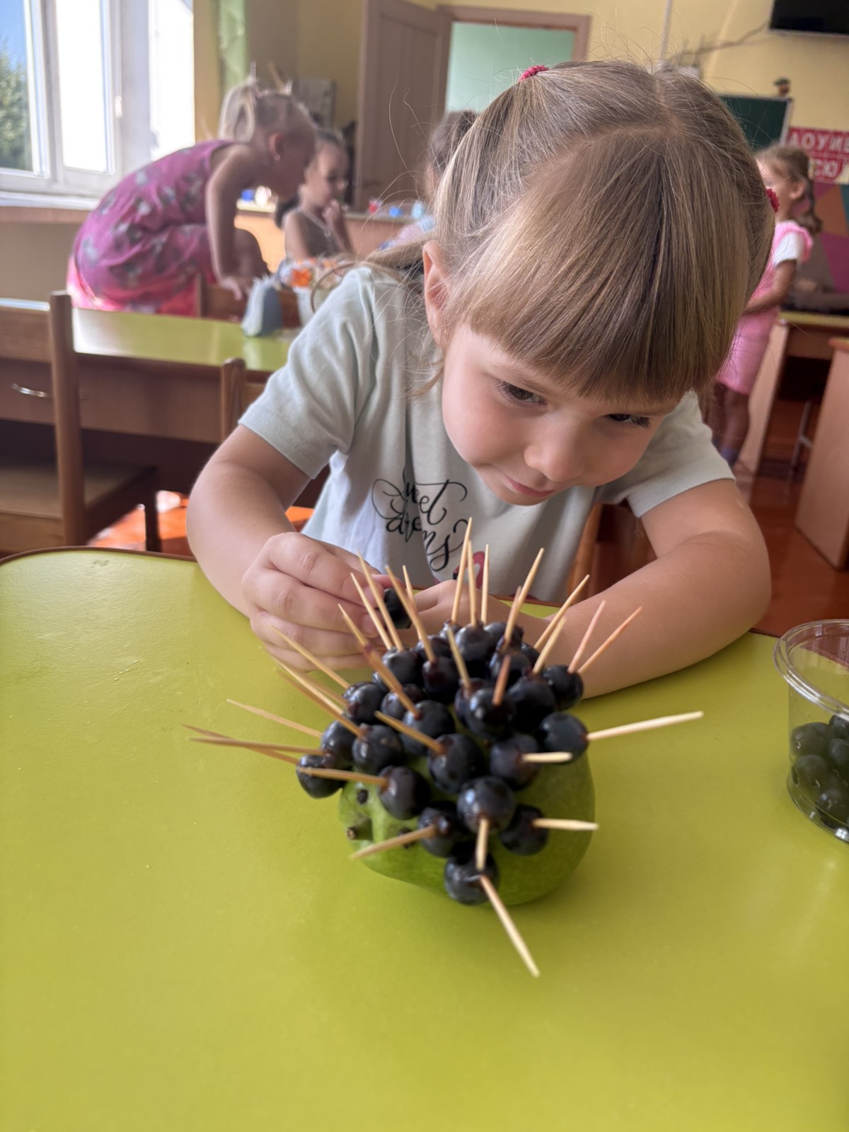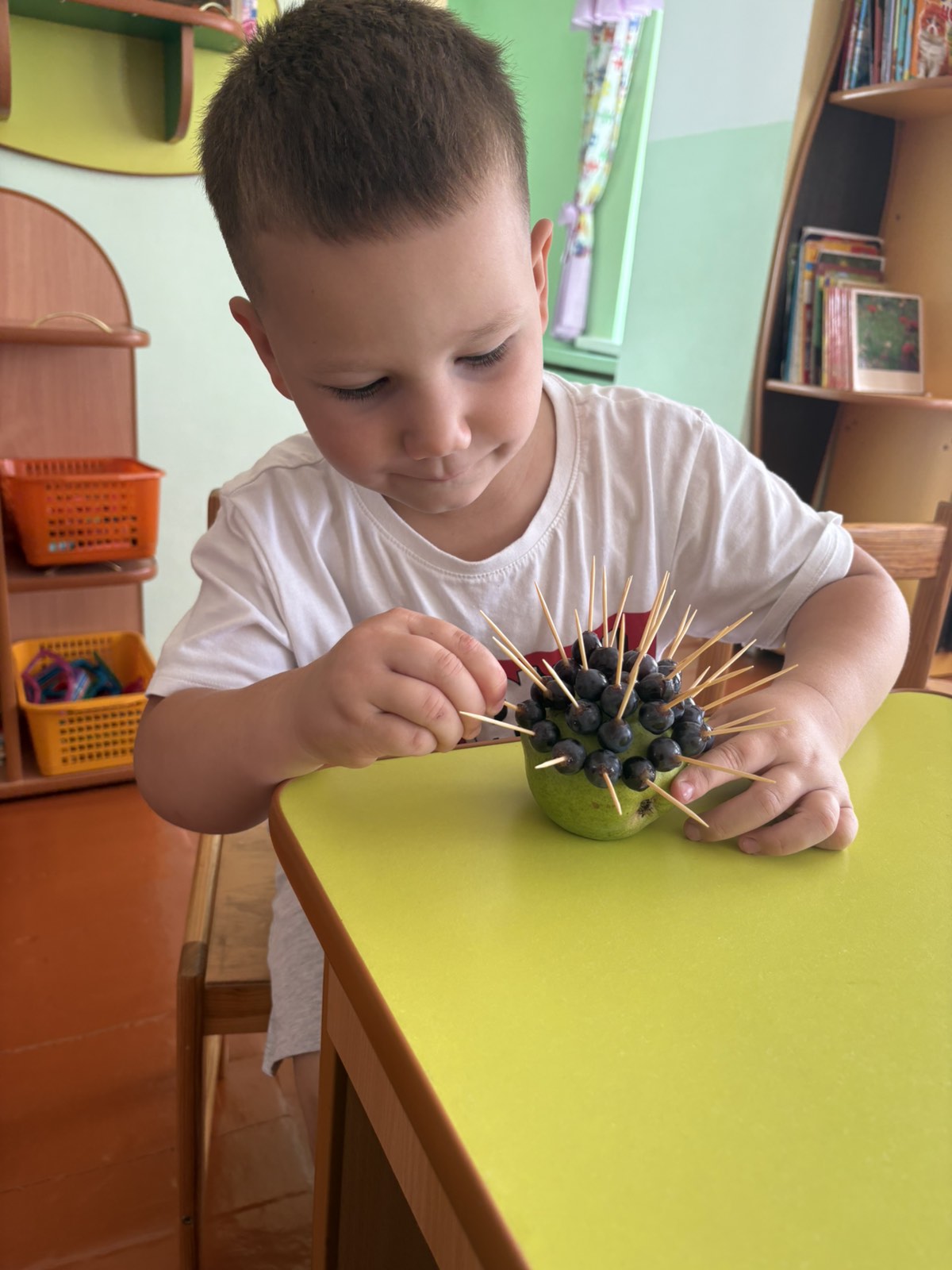 Після цього малята взялися до творчої роботи. Груша стала основою для нашого їжачка, а за допомогою шпажок і винограду дітки створювали його колючки. Кожен старанно працював, проявляв фантазію, акуратність та бажання зробити свою поробку гарною й оригінальною.