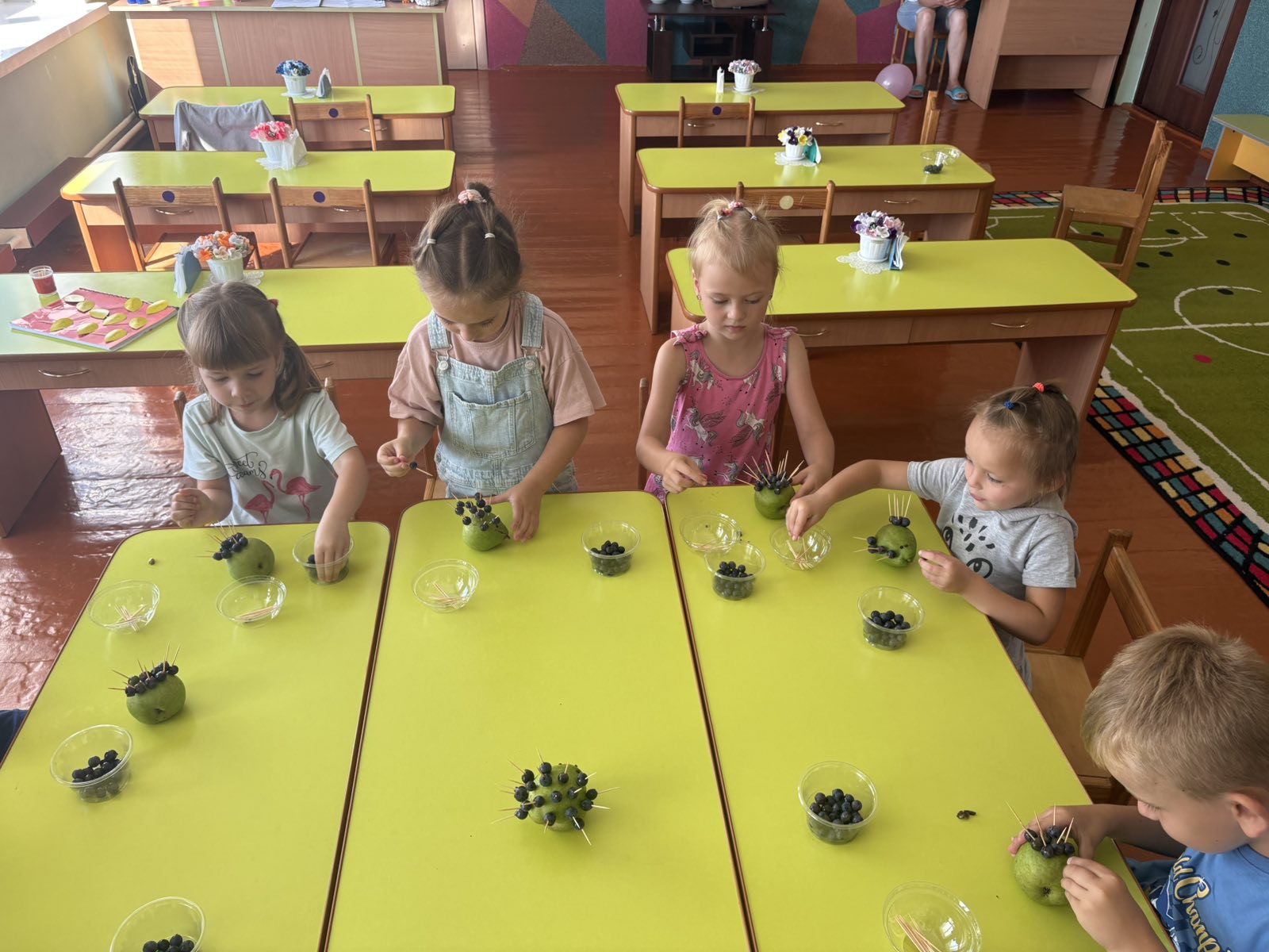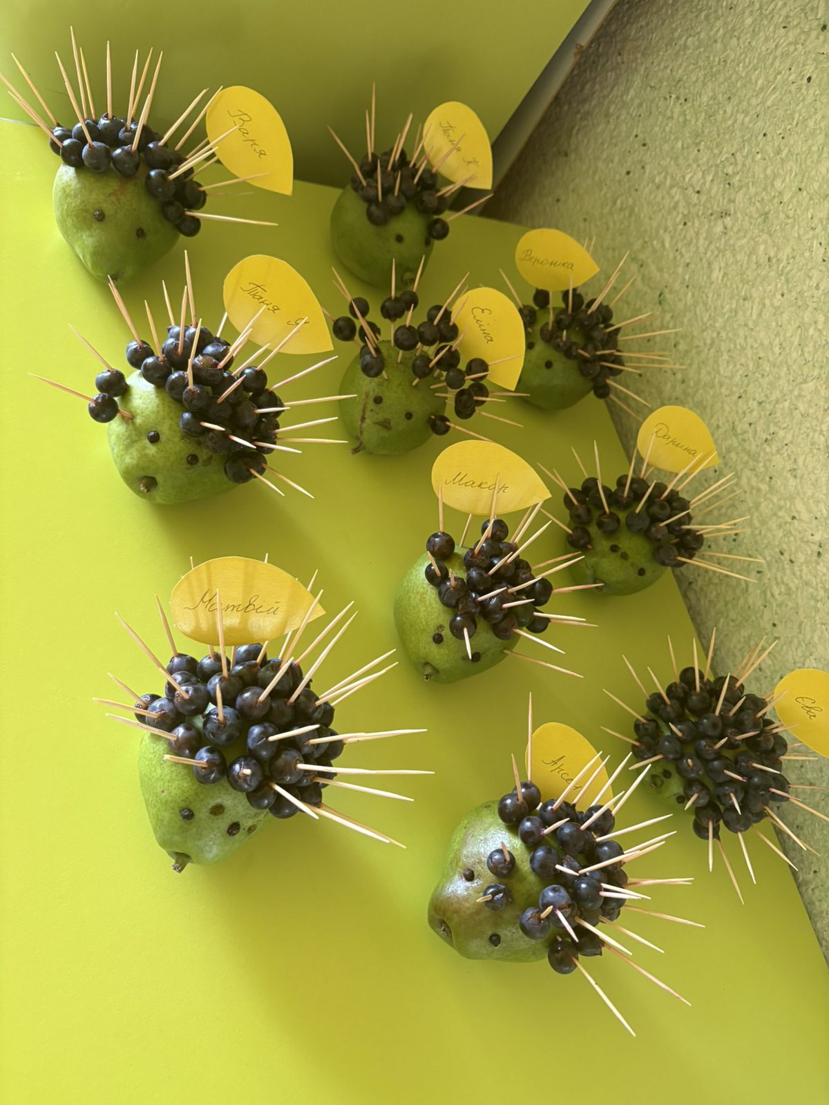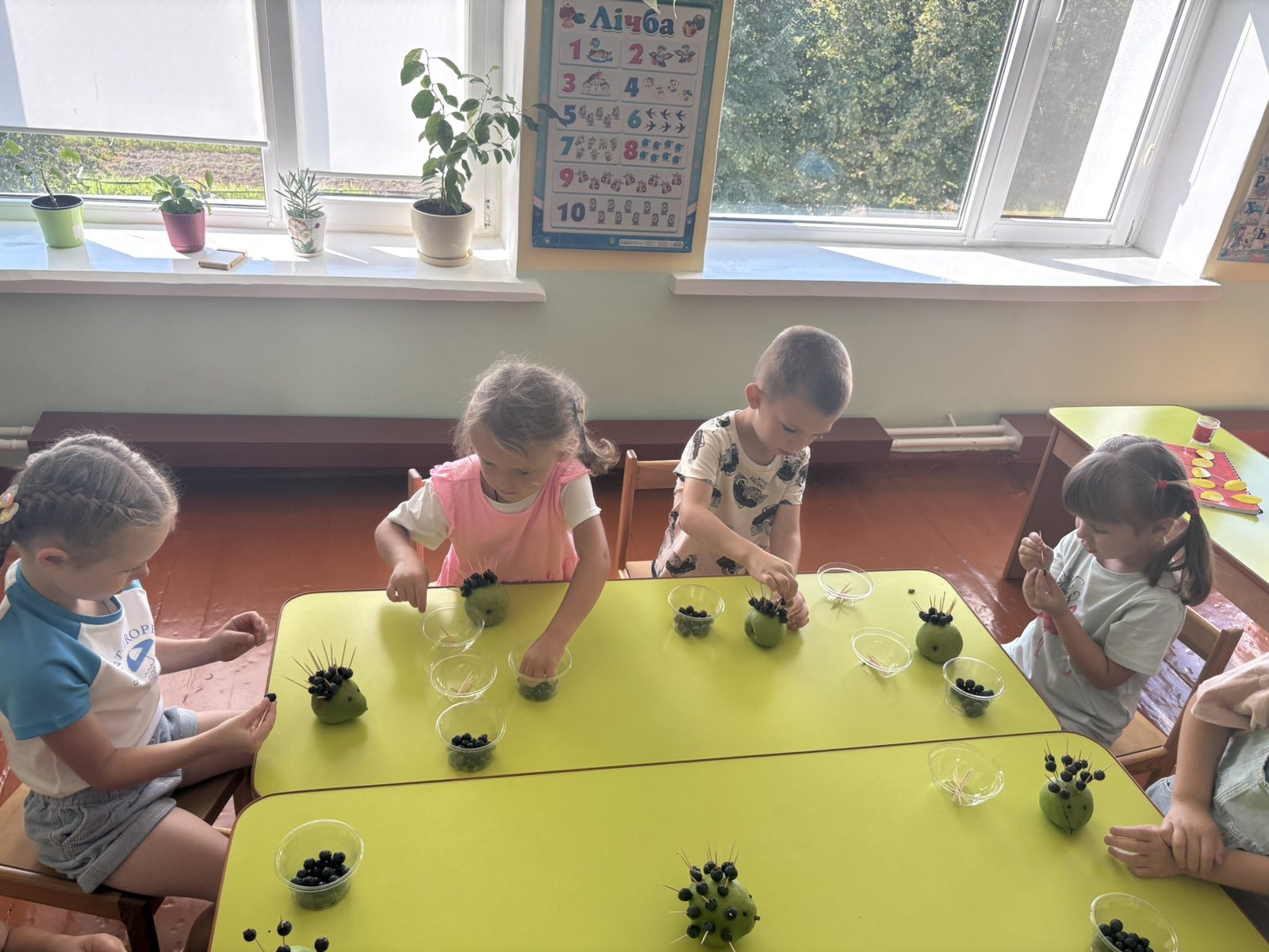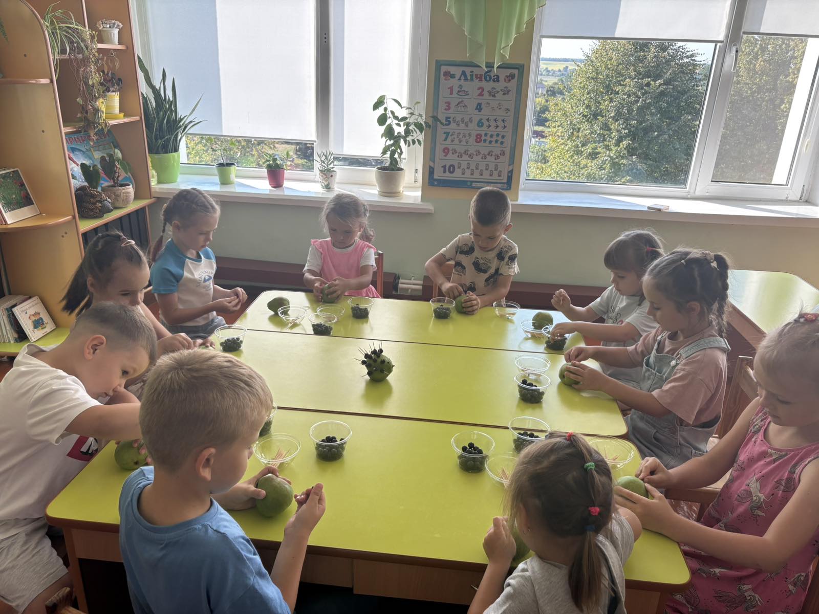 Після цього малята взялися до творчої роботи. Груша стала основою для нашого їжачка, а за допомогою шпажок і винограду дітки створювали його колючки. Кожен старанно працював, проявляв фантазію, акуратність та бажання зробити свою поробку гарною й оригінальною.