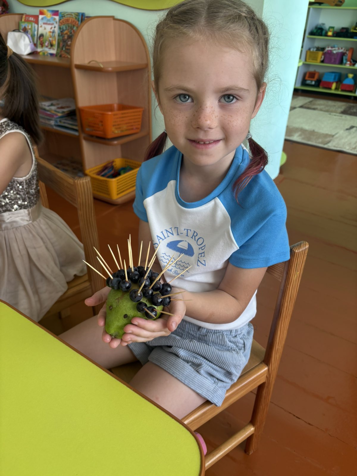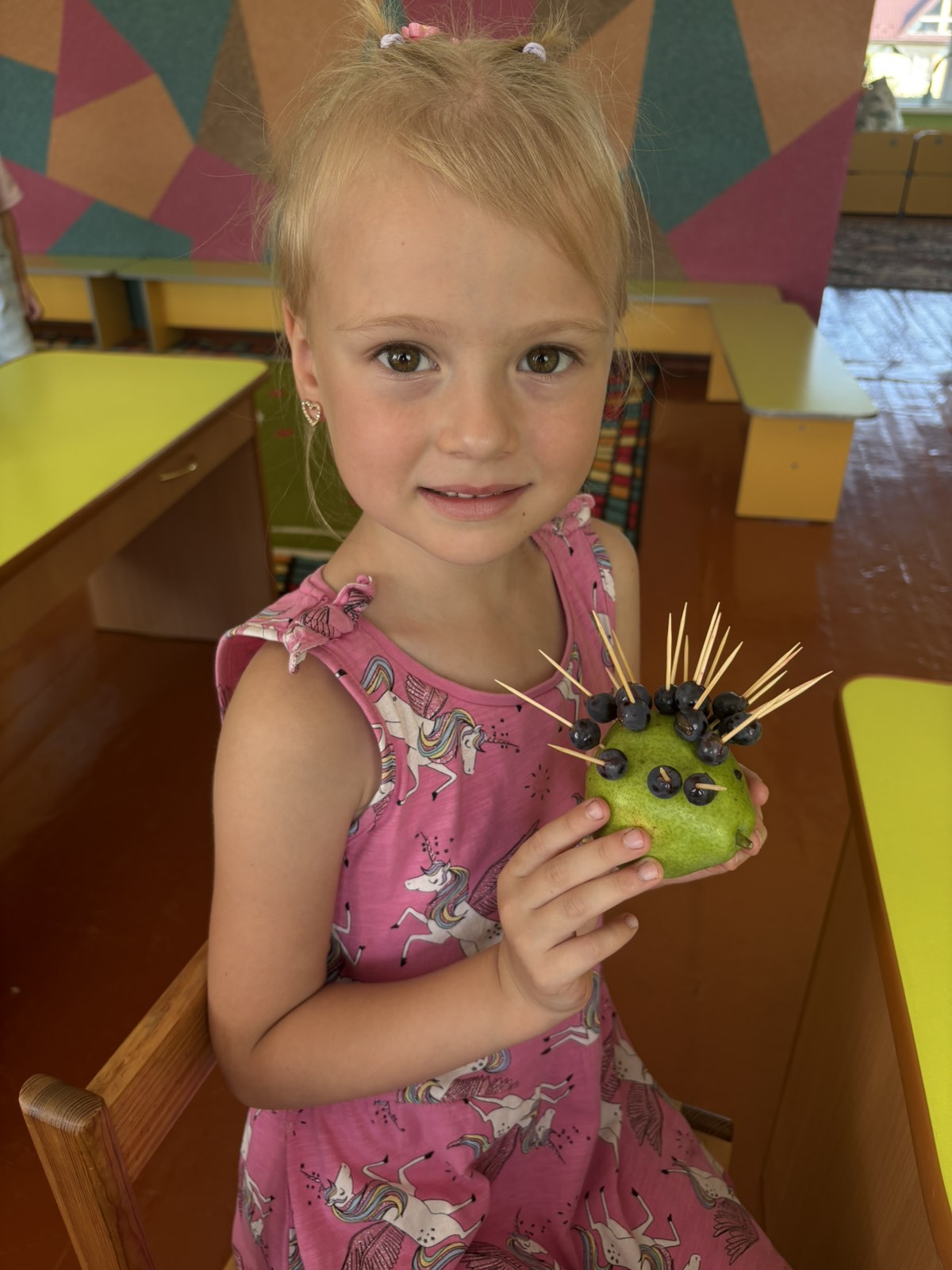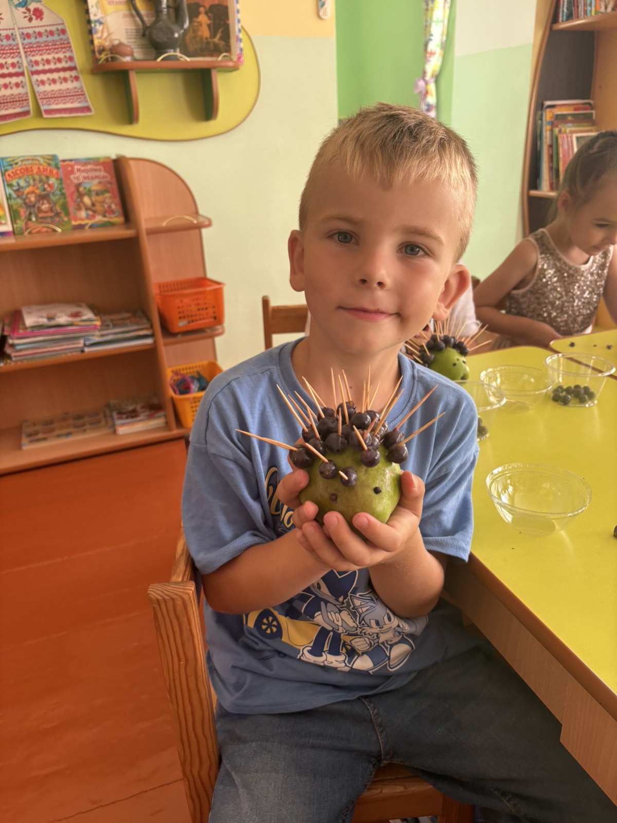 Сьогодні на гуртку «Планета творчості» відбулося цікаве та творче заняття. Дітки виготовляли кумедного їжачка з груші, винограду та шпажок.